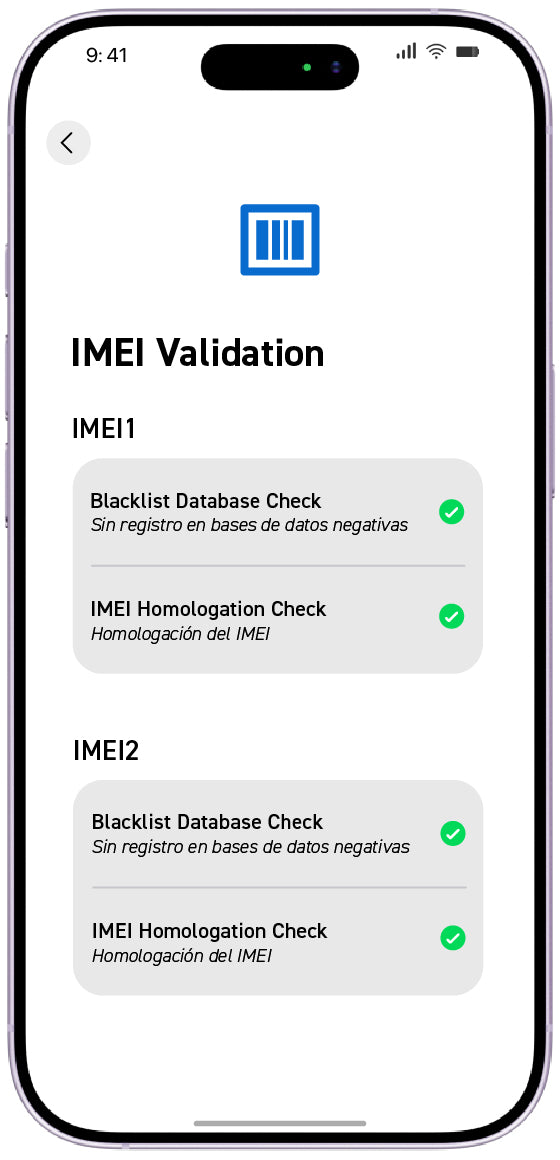 Validamos que el IMEI sea legítimo, esté homologado en el país, esté libre de reportes y cumpla requisitos legales.