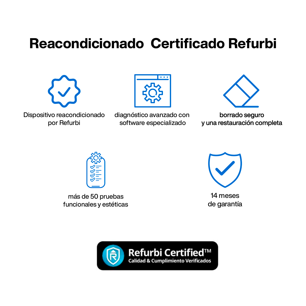 En Refurbi, cada equipo es reacondicionado profesionalmente, probado y certificado, con hasta 14 meses de garantía.