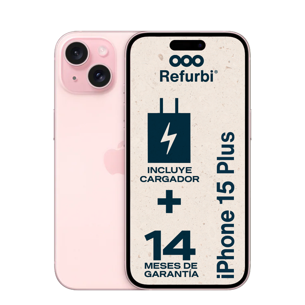 El iPhone 15 Plus es el equilibrio perfecto entre un diseño moderno, pantalla envolvente, gran batería y la potencia del chip A16 Bionic. Ideal para usuarios exigentes que buscan un iPhone con excelente rendimiento, gran duración de batería y cámaras de última generación. En Refurbi reacondicionamos cada unidad profesionalmente para entregártela 100 % funcional, probada y con garantía de hasta 14 meses.