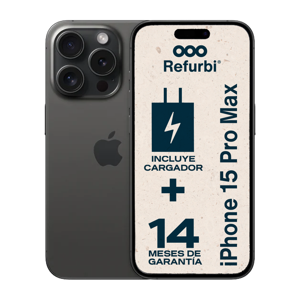 El iPhone 15 Pro Max es el dispositivo más avanzado de Apple hasta la fecha. Fabricado en titanio de grado aeroespacial, combina ligereza, durabilidad y un diseño sofisticado. Incorpora el potente chip A17 Pro para un rendimiento profesional, junto con una cámara de 48 MP con zoom óptico de 5x y la nueva Dynamic Island. En Refurbi reacondicionamos cada equipo con estándares rigurosos para ofrecerte un smartphone 100 % funcional, probado y con hasta 14 meses de garantía.
